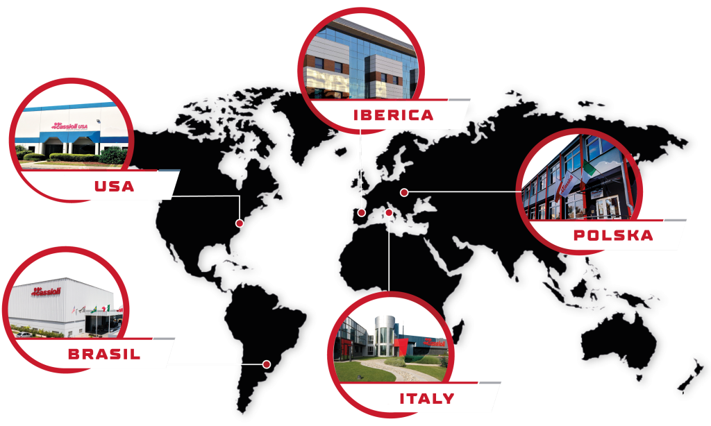 O crescimento da Cassioli começa com a abertura e o investimento em mercados estrangeiros: nascem novas realidades com identidades industriais próprias, autônomas do ponto de vista do potencial de projeto, produção e comercial. Após ter consolidado suas competências e seguindo o sucesso da empresa no mercado italiano, outros estabelecimentos de produção foram abertos no exterior.
