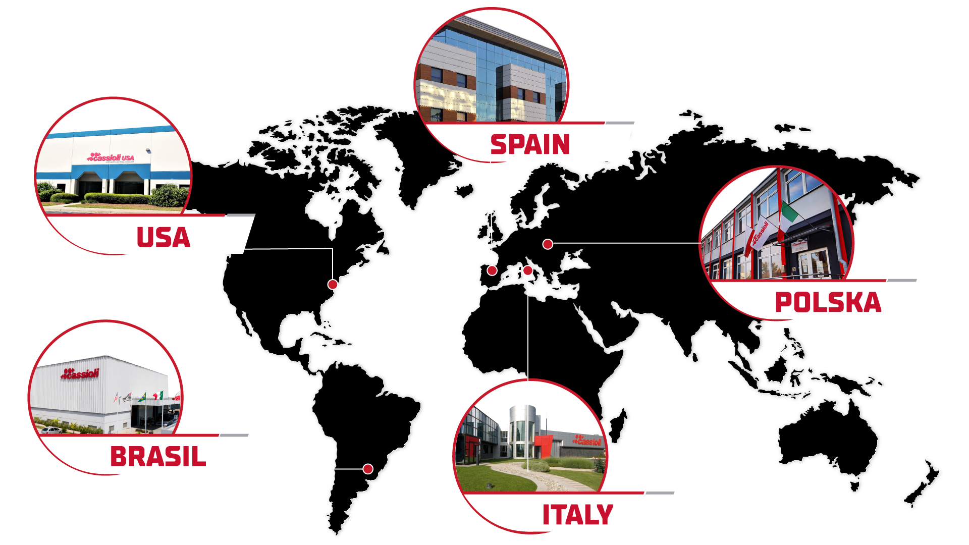 Além da histórica sede em Torrita di Siena, inaugurada em 1943, a Cassioli abriu ao longo dos anos locais de produção e escritórios comerciais em várias partes do mundo, de modo a responder rápida e eficientemente às necessidades de uma clientela cada vez mais internacional.