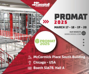 Cassioli ultrapassa as fronteiras nacionais e em 2025, além das numerosas feiras na Europa e no Brasil, desembarcará em Chicago para a Promat, uma das exposições mais relevantes no setor da intralogística dos Estados Unidos. Com mais de 1.000 fornecedores líderes em âmbito mundial em soluções para a produção e a cadeia de fornecedores, Promat reúne as pessoas, as tecnologias e as ideias revolucionárias que estão plasmando o futuro desse setor.