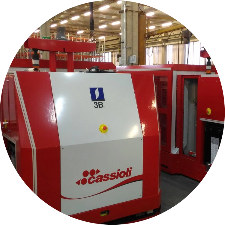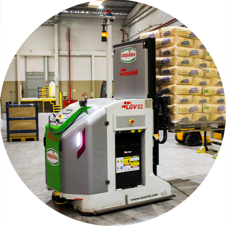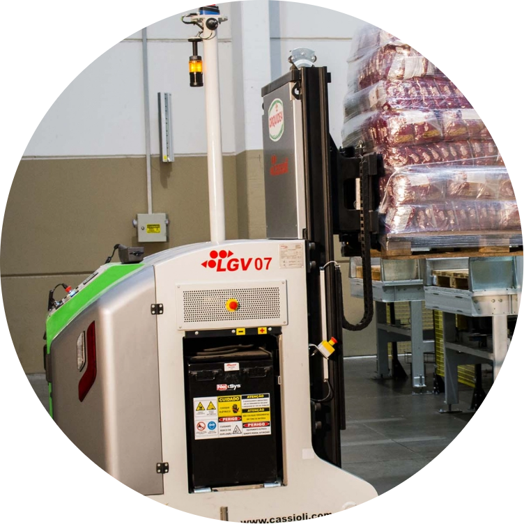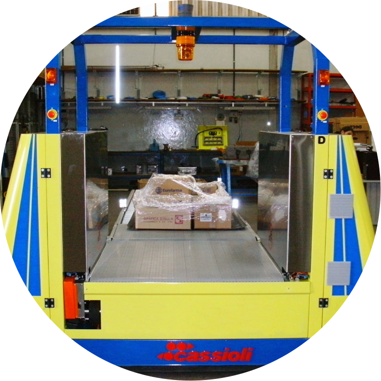 O veículo guiado automaticamente AGV (Automatic Guided Vehicles) da Cassioli é uma solução extremamente flexível para manipulação de produtos e uma excelente alternativa aos transportadores e carrinhos manuais. O sistema AGV garante total integração entre o sistema de informações de alto nível utilizado pelo cliente (Cliente, Host, sistema departamental, SAP, etc.) e outros sistemas ou dispositivos de gestão, como empilhadeiras, áreas robotizadas, paletizadores, linhas de montagem e armazéns automáticos. O sistema de controle da Cassioli é capaz de monitorar todas as informações relativas ao posicionamento e status dos veículos AGV, bem como as solicitações feitas pelo sistema de produção. Desta forma, o sistema processa e determina em tempo real o percurso mais adequado à situação atual (planejamento e rota dos veículos). Os veículos automáticos AGV da Cassioli diferem substancialmente em termos de peso e tamanho da carga, carga simples ou múltipla, tipo de carga e sistema de navegação: A Cassioli desenvolverá a melhor solução, com base nas necessidades do cliente, independentemente do tamanho e tipo de carga a ser manipulada. Os técnicos da CASSIOLI, depois de ter visto as condições planivolumétricas e ambientais do local onde o sistema será implementado, adotarão também o sistema de navegação mais adequado, escolhendo entre natural ou laser.