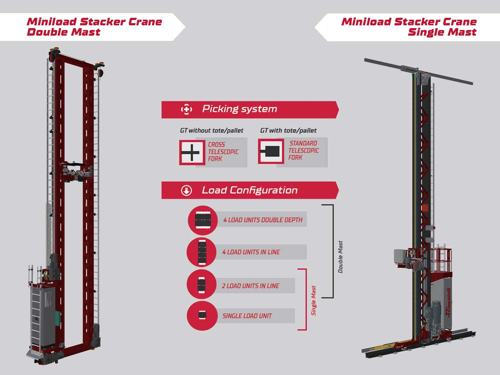 Para cada tipo de transelevador, estão disponíveis diferentes configurações de carga. Os transelevadores são capazes de deslocar até quatro pneus ao mesmo tempo; cada garfo, todavia, pode ser independente dos outros, para garantir, se for necessário, a máxima flexibilidade do lote unitário.