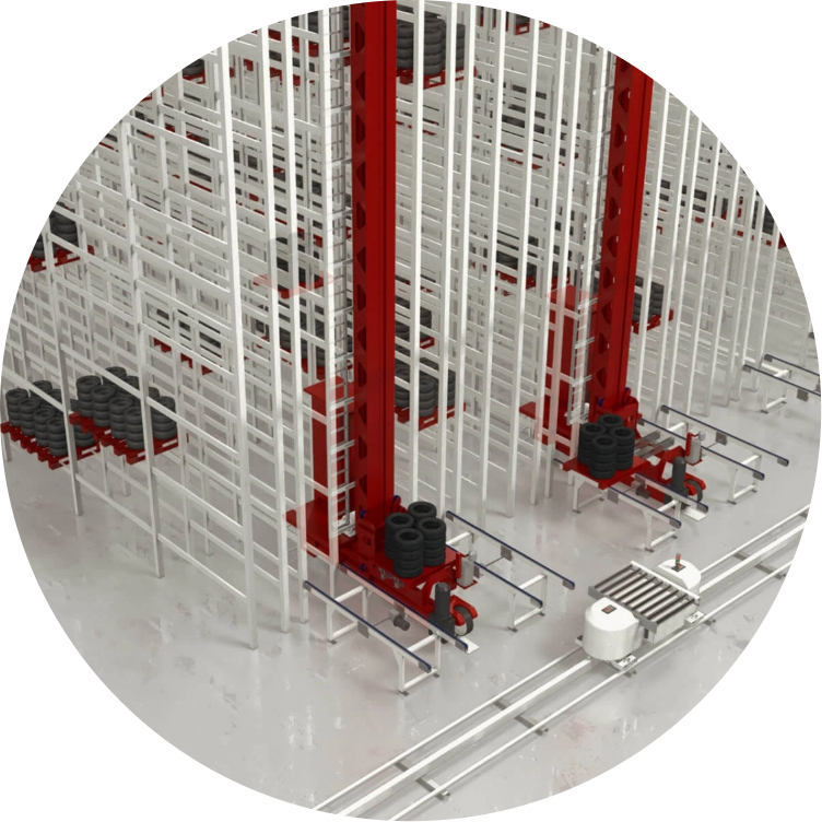 Armazém automático e sistema de recuperação para tambores presentes em paletes. O armazém de tambores da Cassioli permite armazenar de forma rápida, segura e eficiente os tambores que serão utilizados pela Tire Building Machine para a produção de pneus de alta qualidade. O armazém de tambores dispõe de um ou mais transelevadores que permitem manipular facilmente os tambores, armazená-los e prepará-los para retirada para as fases seguintes do processo. O sistema de gestão da Cassioli para o controle do armazém controla o fluxo dos materiais e garante a gestão completa dos dados.