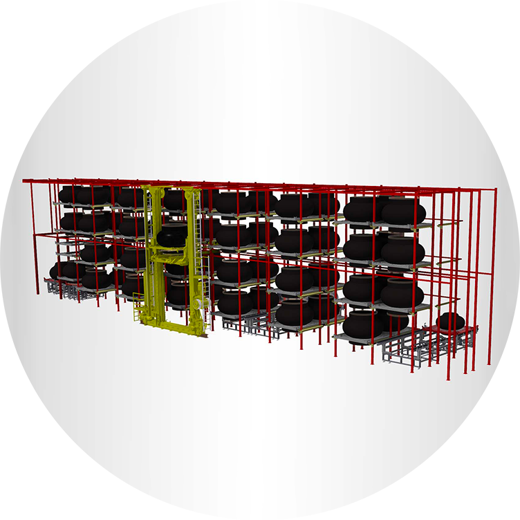 O armazém de Green Tire da Cassioli é um sistema totalmente personalizável, para que as unidades de armazenamento possam ser organizadas de acordo com as necessidades e pedidos específicos do cliente. Os transelevadores podem mover até quatro pneus ao mesmo tempo, mas cada garfo é independente, por isso também podem operar com lotes individuais. Os altos potenciais de carga e manipulação, em comparação com os sistemas de armazenamento manuais, tornam estes sistemas indispensáveis em sistemas específicos industriais de produção de pneus.