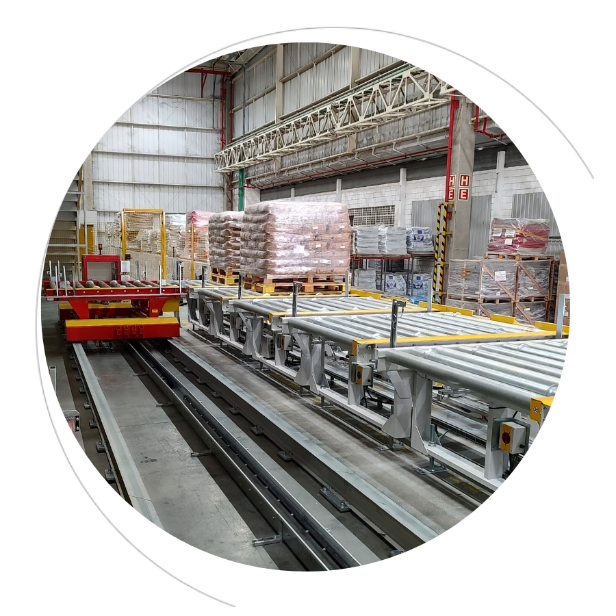 A estrutura de armazenagem e o trilho do transelevador foi especialmente desenvolvida com um conjunto de sapatas com ajustes para compensar eventuais deformações e desnivelamento de piso