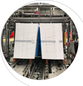 O sistema leva as placas uma a uma seguindo a sequência específica solicitada no pedido de carregamento (perfeitamente integrado com COSENTINO SAP); caso haja excesso de placas, a carga retorna ao armazém e as placas são agrupadas em uma nova carga, sempre de forma automática.