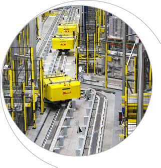 Todos os paletes são etiquetados com um código de barras e transportados dentro do armazém automático por meio de um sistema de carros RGVs.