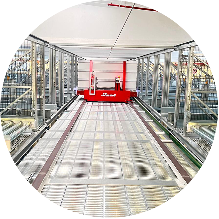 As soluções shuttle “mother-baby” da Cassioli são projetadas para o armazenamento de semiacabados (WIP) em instalações existentes com limitações de altura. Este sistema inovador permite ligar o nível do solo a vários níveis de armazenamento, otimizando o espaço vertical sem intervenções estruturais complexas.